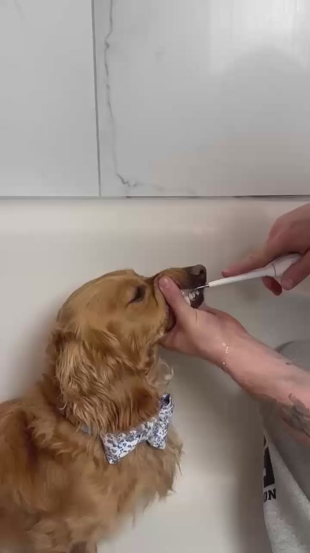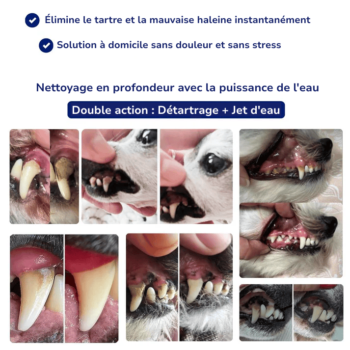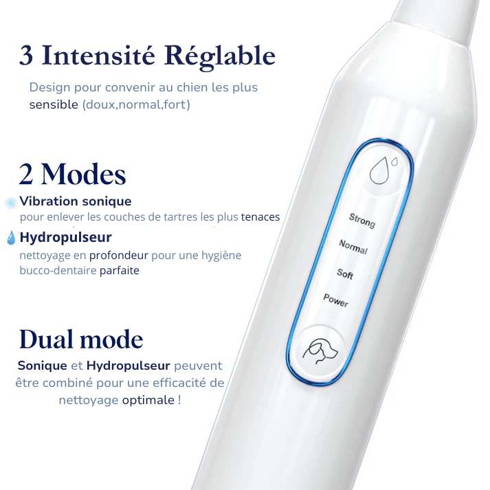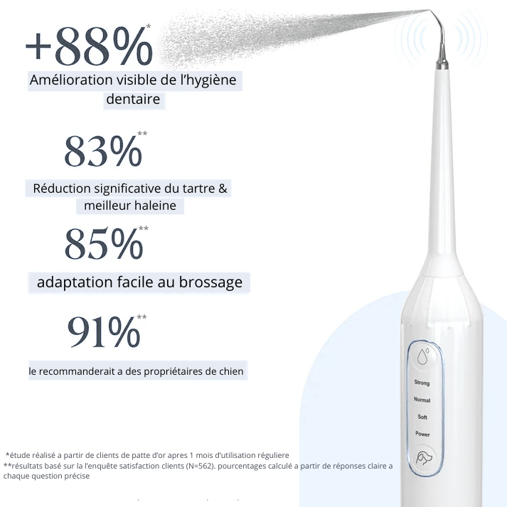introduit progressivement et positivement, le soin dentaire à domicile est bien accepté par la grande majorité des chiens grace a notre technologie sonique, qui ne fais aucun bruit et ne parasite pas le comportement de votre compagnon et améliore nettement l’hygiène sans gestes agressifs.