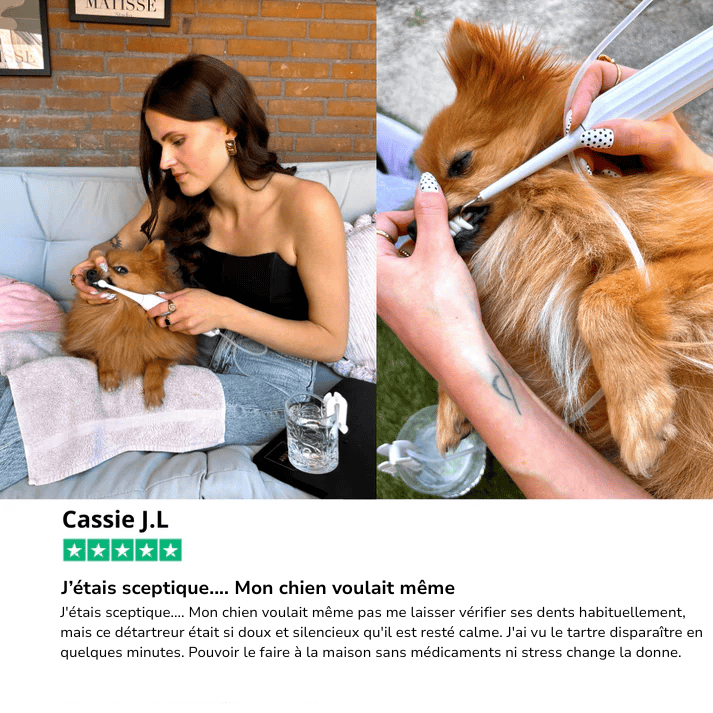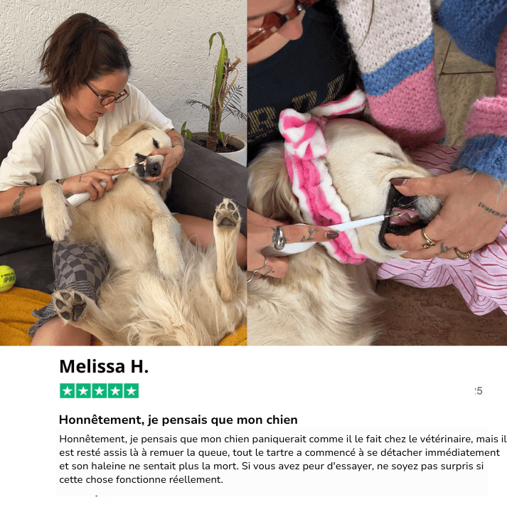 Une seule utilisation du kit permet d'enlever la majorité du tartre et des plaques, le reste s'enlève sous 2 à 3 utilisations à utiliser régulièrement, il vous permet d'économiser temps, argent et sans stress pour votre chien !